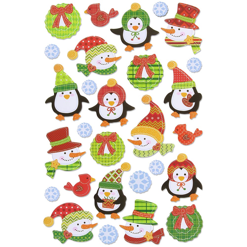 El producto está compuesto por pegatinas fabricadas en goma eva, con un adhesivo de alta calidad que garantiza una fijación duradera. Cada paquete contiene un surtido de pegatinas de diferentes tamaños y formas, todas con el mismo diseño de pingüinos en un entorno nevado, ofreciendo variedad para satisfacer diferentes necesidades creativas.