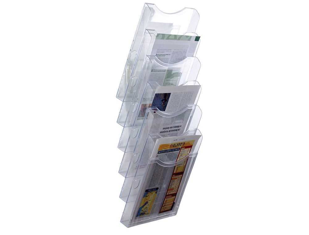 El Expositor Mural Archivo 2000 De Pared es un organizador de documentos que consta de 6 bandejas transparentes de tamaño Din A4. Está diseñado para ser colocado en la pared y facilitar el almacenamiento y acceso a documentos de forma ordenada y práctica.