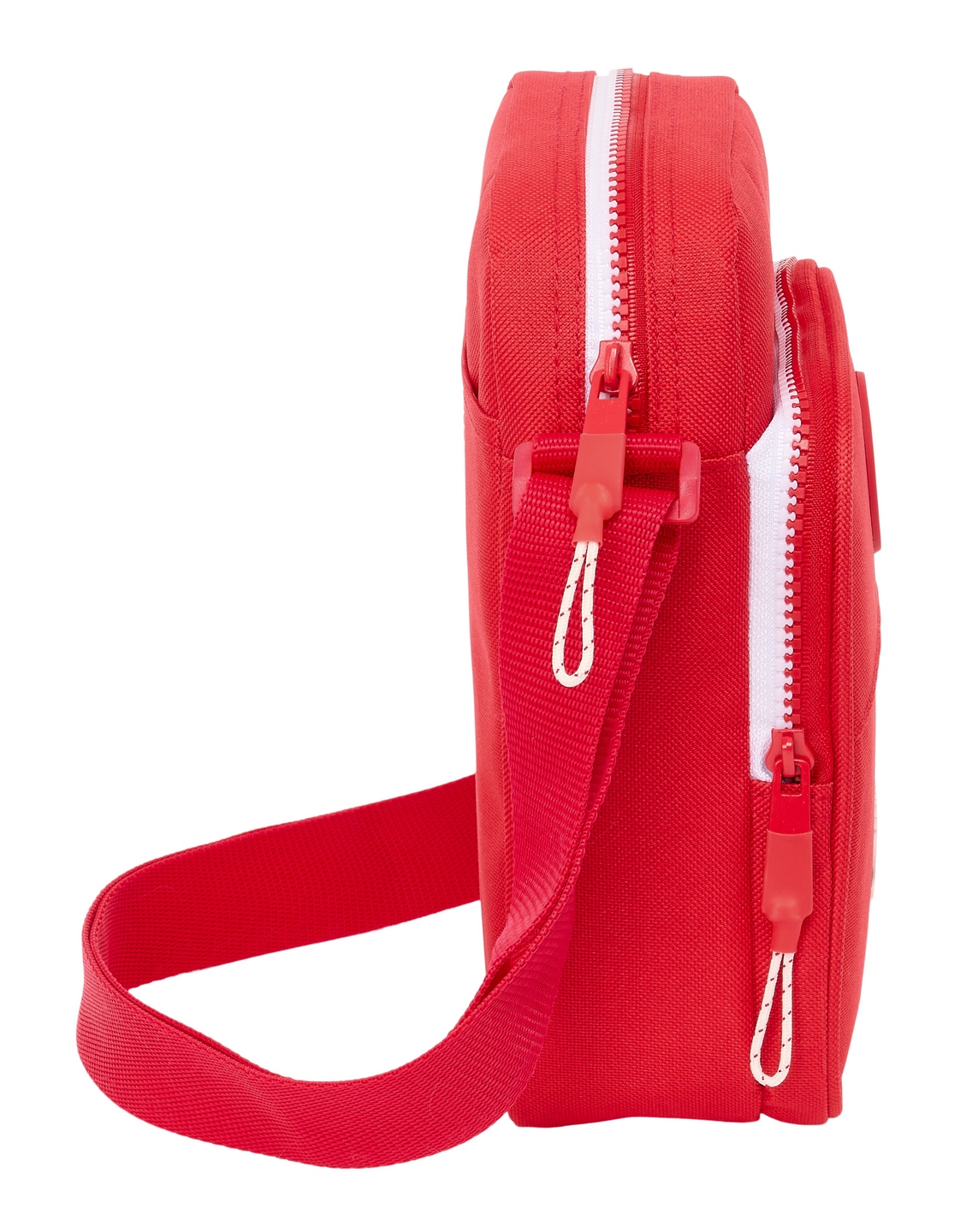 Compartimento principal con cremallera. Bolsillo frontal con cremallera. Bandolera ajustable. Compartimento trasero con cierre de velcro.