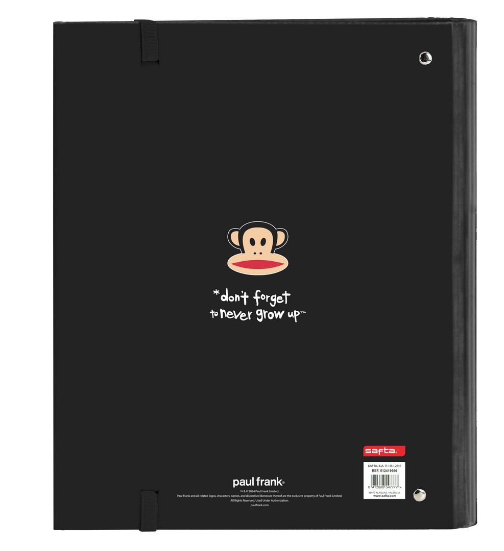 Está fabricada con materiales de alta calidad que garantizan resistencia y durabilidad. Las anillas de 35 mm permiten sujetar de forma segura las hojas, mientras que el diseño de Paul Frank aporta un toque de diversión a la carpeta. El recambio incluido facilita la sustitución de hojas cuando sea necesario, asegurando así su uso a largo plazo.