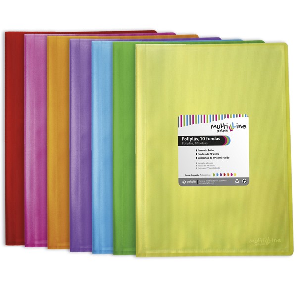 La Carpeta Con Fundas Poliplás PP Translúcido Semirígido Rayado Vertical Folio 20 Fundas Amarillo Multiline Grafoplás es un accesorio de oficina diseñado para almacenar y proteger documentos de tamaño folio. Cuenta con 20 fundas de polipropileno translúcido y semirrígido, con capacidad para organizar y presentar papeles de forma ordenada y profesional.