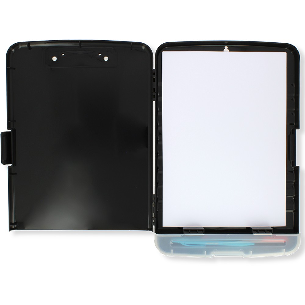 Para utilizar la Carpeta Con Pinzas + Organizador Negro, simplemente coloca los documentos que deseas archivar entre las pinzas para mantenerlos en su lugar de forma segura. El organizador interno te permite guardar bolígrafos, lápices, notas adhesivas y otras herramientas de escritura, manteniendo todo al alcance de tu mano y facilitando la organización de tus tareas diarias.