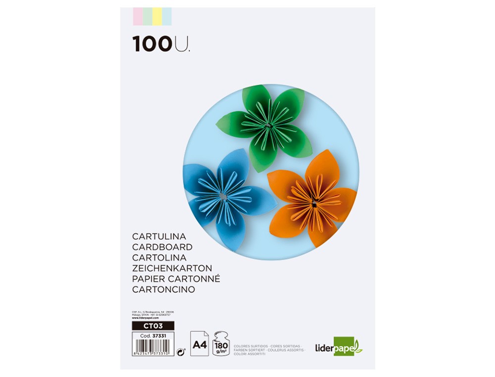 La cartulina LIDERPAPEL A4 180g/m2 es perfecta para proyectos escolares, presentaciones, informes, manualidades, scrapbooking y mucho más. Su grosor y textura suave hacen que sea fácil de trabajar y se vea profesional. Además, con 4 colores surtidos, tendrás una amplia gama de opciones para elegir y dejar volar tu creatividad. ¡No te quedes sin tu paquete de 100 hojas!