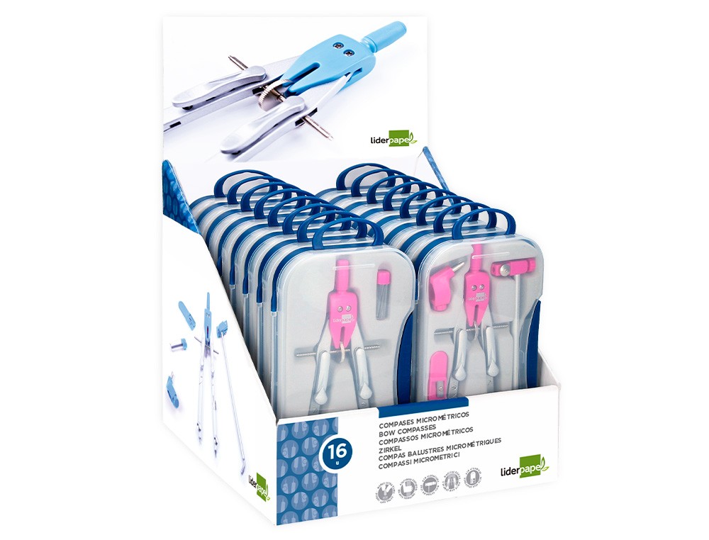 Compas liderpapel con adapatador alargadera y mango extra soft expositor de 16 estuches 2 modelos