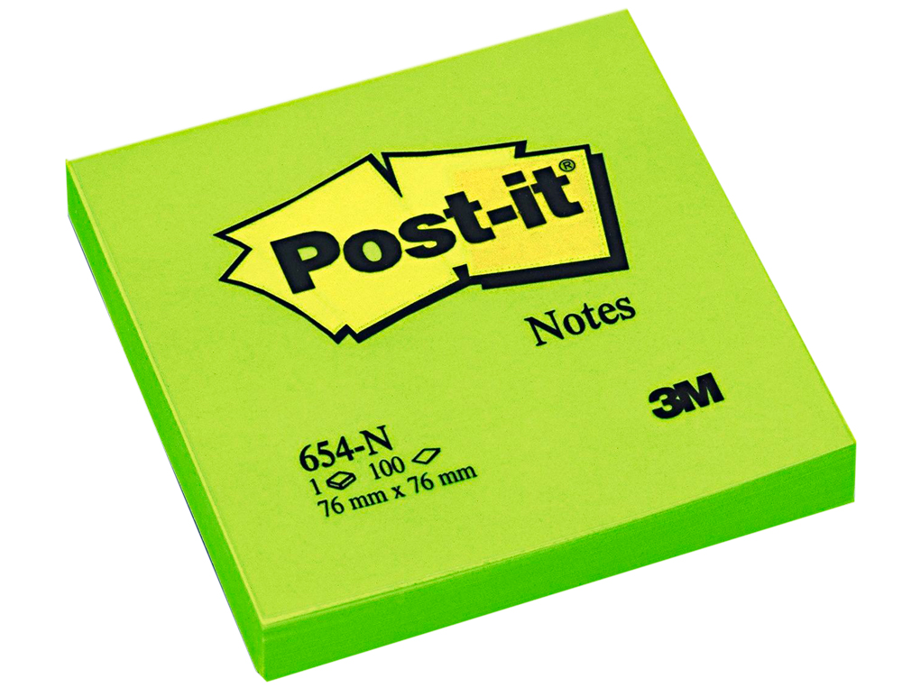 El Bloc De Notas Adhesivas Post-It es un conjunto de 100 hojas de papel verde neon, de tamaño 76x76 mm, que pueden adherirse a superficies para tomar notas, recordatorios o ideas de forma rápida y práctica. Su adhesivo permite quitar y poner las notas sin dejar rastros, manteniendo la superficie limpia.