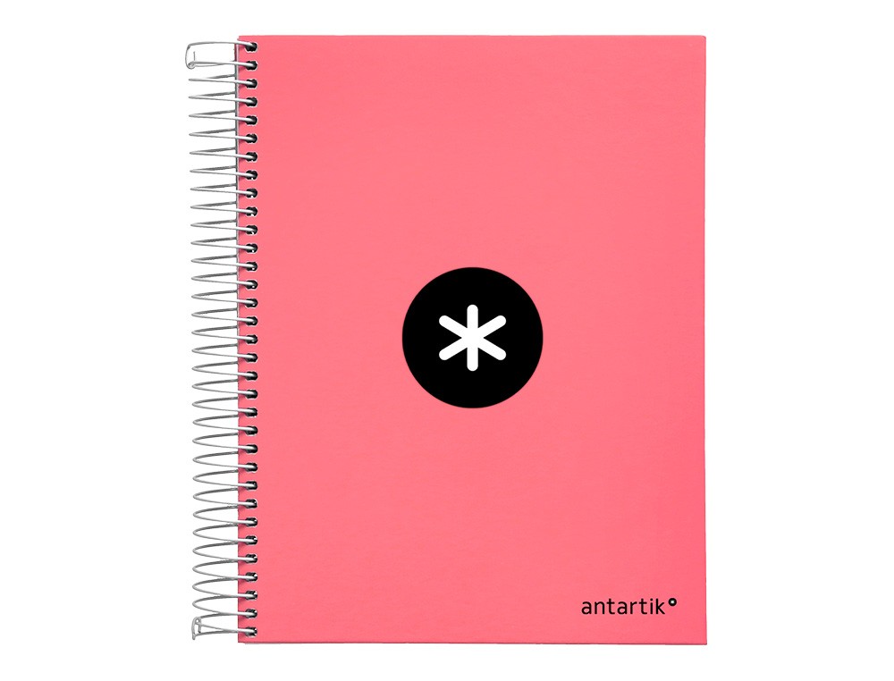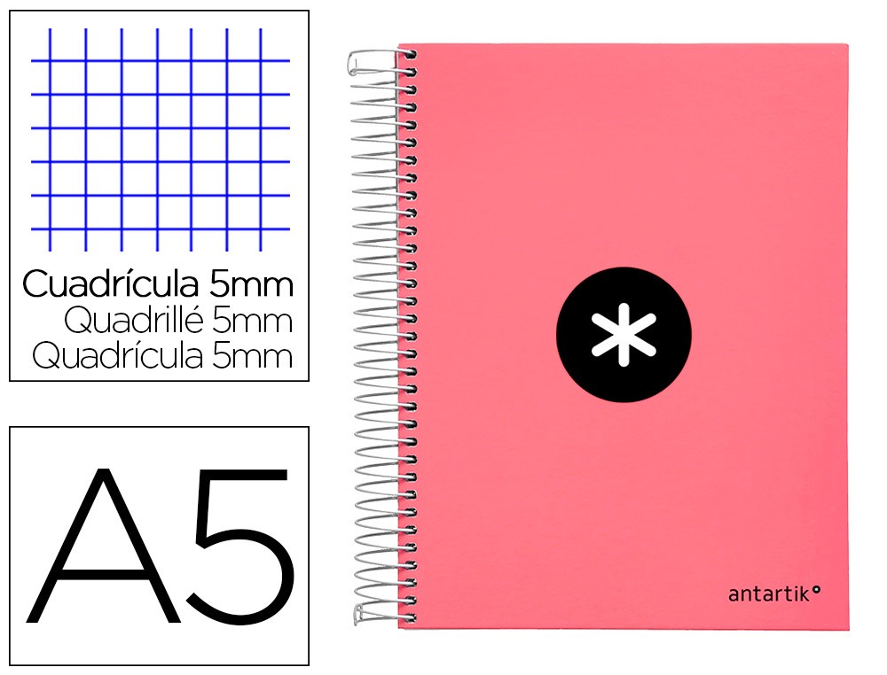 El Cuaderno Espiral Liderpapel A5 Micro ANTARTIK Tapa Forrada120H 100 Gr Cuadro 5 Mm 5 Band6 Taladros Color Coral es un cuaderno de tamaño A5 con espiral y tapa forrada, ideal para tomar notas y hacer dibujos. Su diseño elegante en color coral lo hace perfecto para uso escolar o profesional.