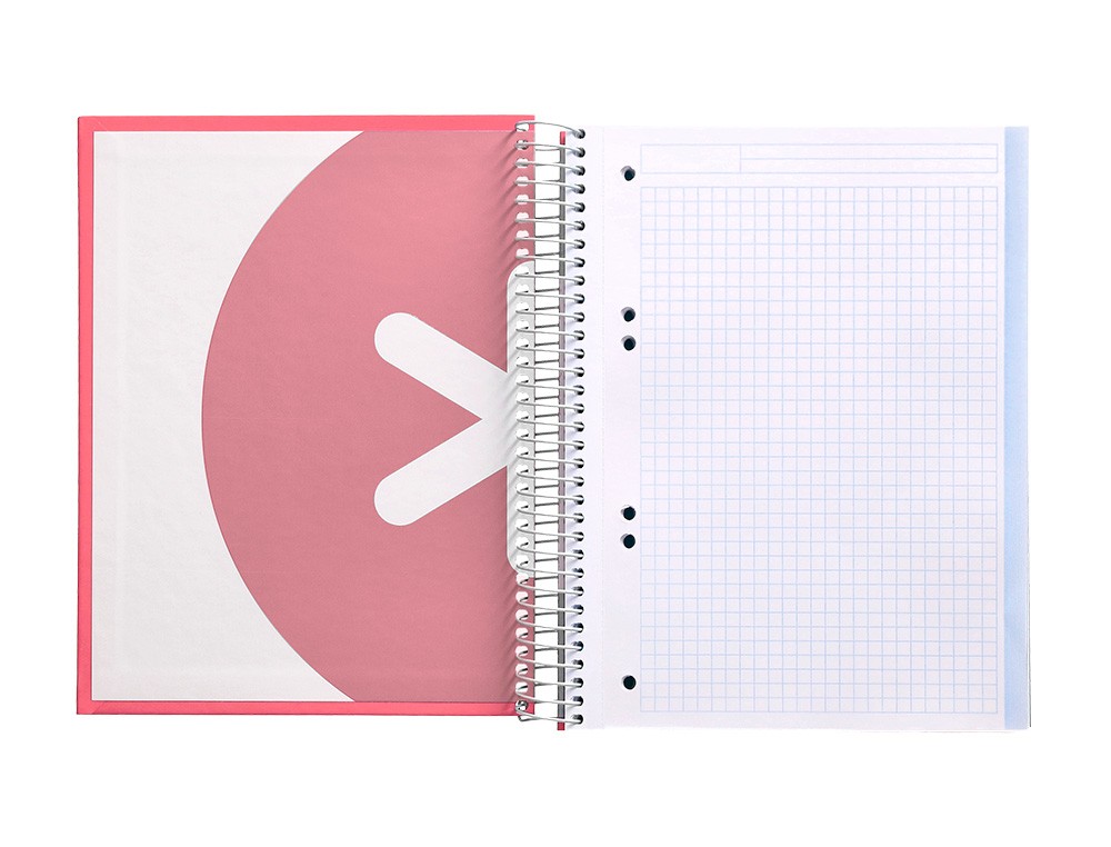 Este cuaderno está compuesto por tapa forrada, espiral resistente, hojas de 100 gramos de grosor, cuadrícula de 5 mm, 120 hojas en total y 5 bandas de taladro para archivar. Su diseño en color coral le da un toque de elegancia y estilo.