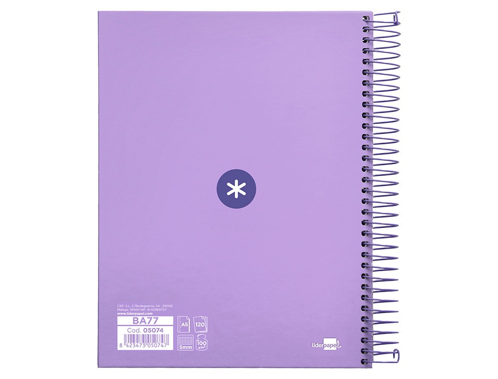 Este cuaderno es ideal para tomar apuntes, realizar dibujos, esquemas, o cualquier tipo de escritura. La cuadrícula de 5mm y las 120 hojas de papel de 100 gramos permiten un uso versátil y de alta calidad. Además, su color lavanda lo hace atractivo y diferenciador.