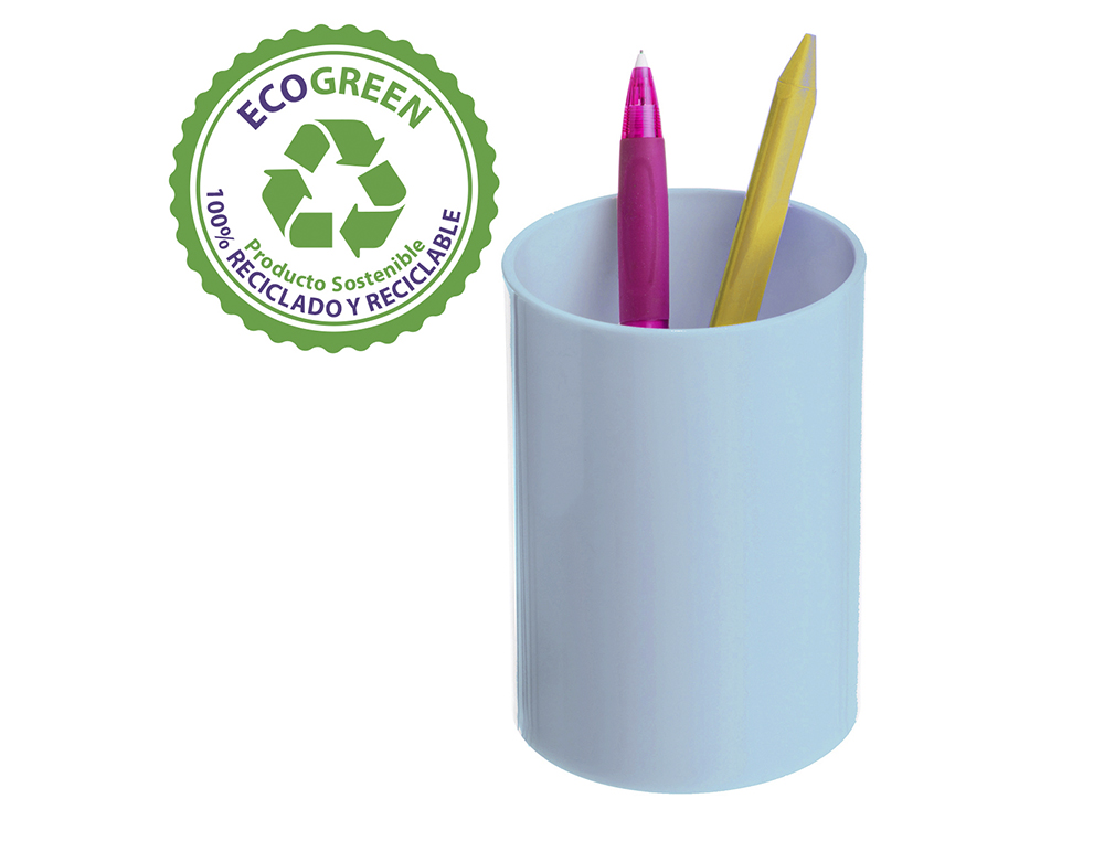 Este cubilete está fabricado en plástico reciclado, lo que lo hace una opción eco-friendly. Su color azul pastel opaco le da un toque de elegancia y modernidad, mientras que su diámetro de 75 mm y alto de 105 mm proporcionan un espacio suficiente para almacenar varios lápices u otros utensilios de escritura. Además, su composición 100% reciclada demuestra el compromiso con el cuidado del medio ambiente.