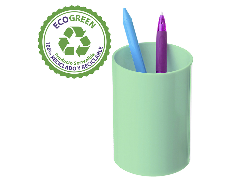 El Cubilete Portalápices Archivo 2000 es un producto de escritorio diseñado para organizar y almacenar lápices, bolígrafos y otros utensilios de escritura. Su diseño en color verde pastel opaco lo hace ideal para cualquier tipo de decoración de oficina. Este cubilete está fabricado con plástico 100% reciclado, lo que lo convierte en una opción respetuosa con el medio ambiente.