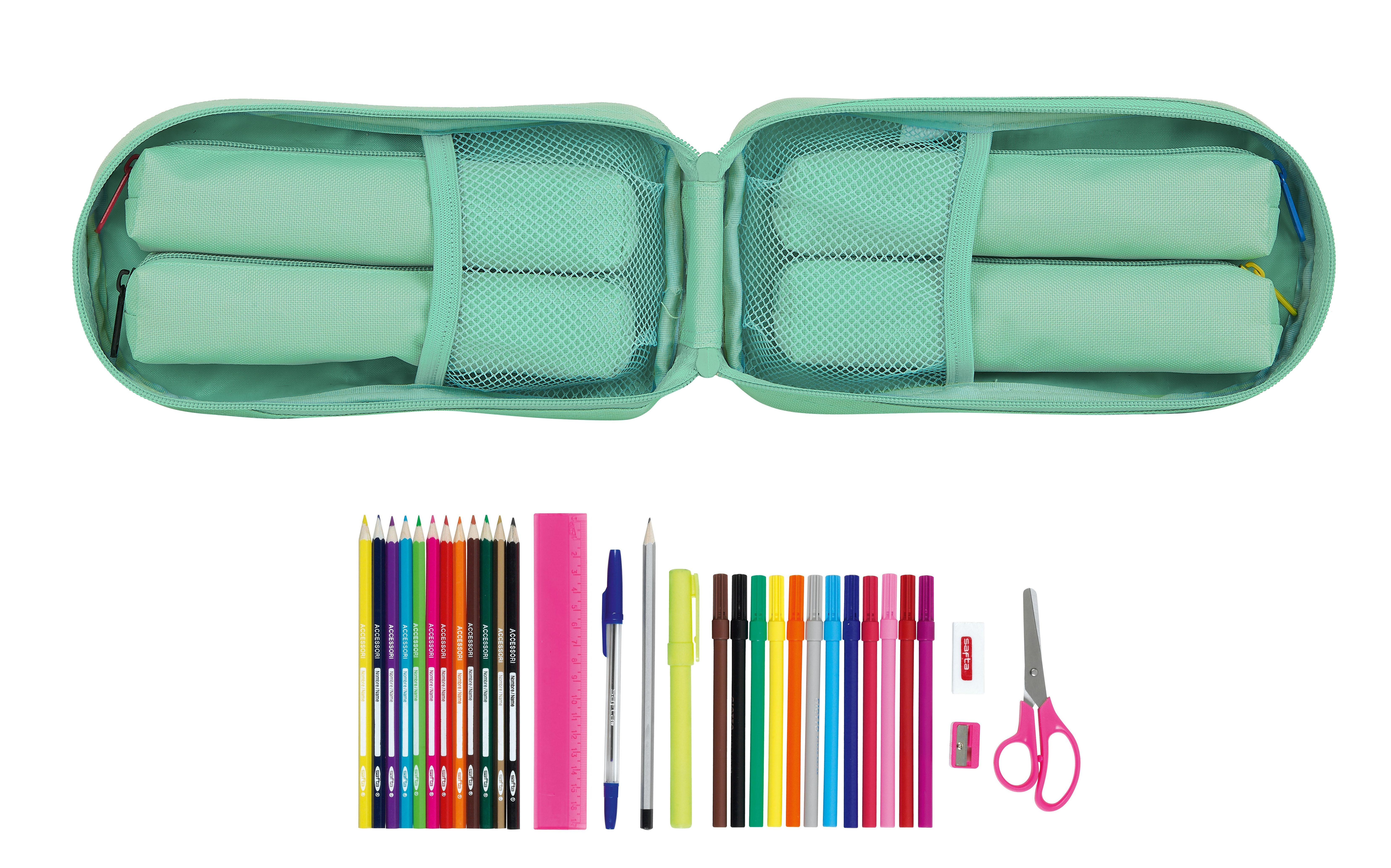 - Contenido: 12 lápices de colores, 12 rotuladores de colores, 1 fluorescente, 3 bolígrafos, 1 lápiz de grafito, 1 sacapuntas, 1 goma de borrar, 1 regla y 1 tijeras.