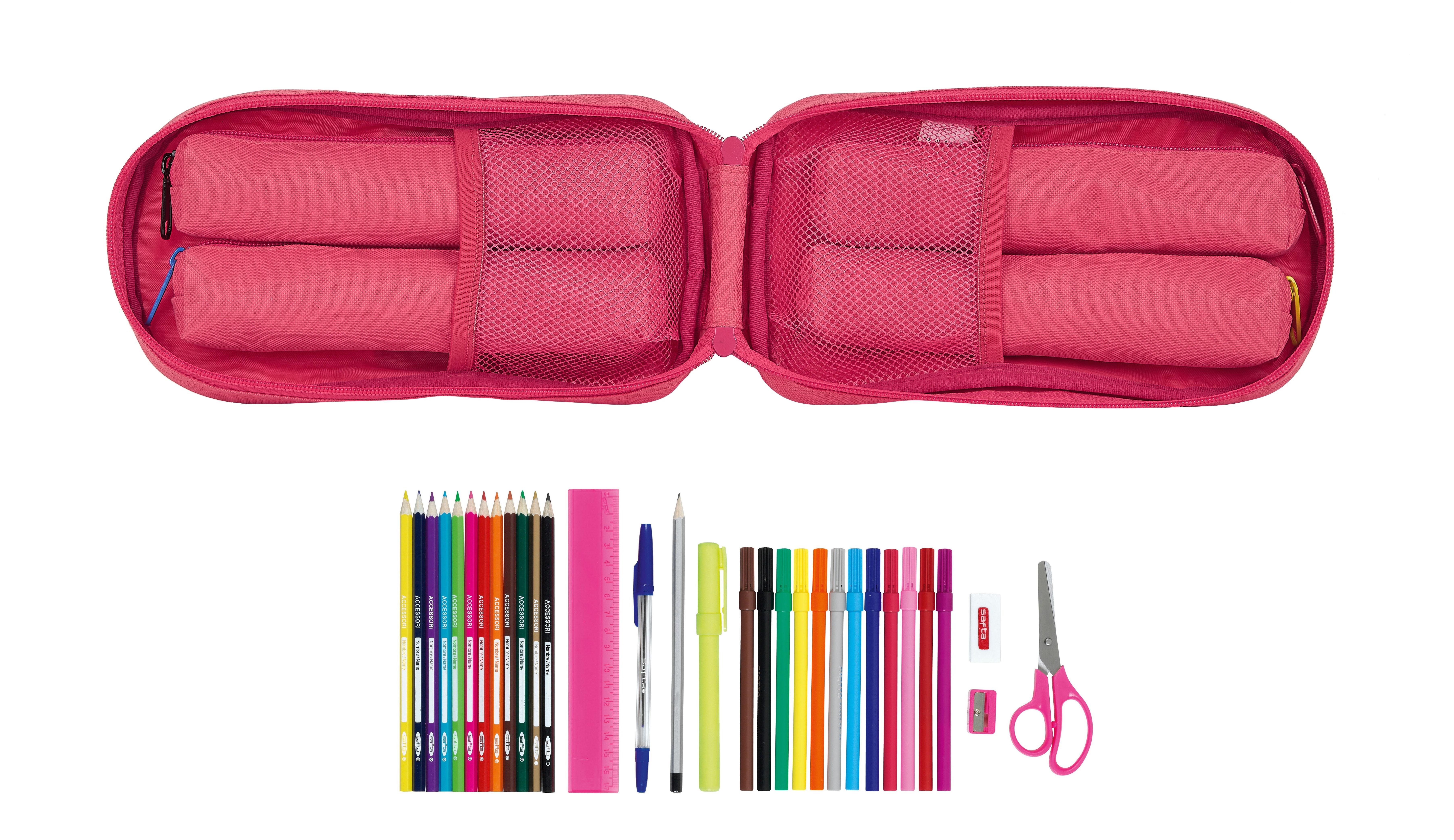 El estuche está compuesto por tres compartimentos principales, cada uno con cierre de cremallera para una mayor seguridad. En el primer compartimento, encontrarás 12 lápices de colores, 12 rotuladores de punta fina y 1 goma de borrar. En el segundo compartimento, hallarás 1 tijera de punta redonda, 1 pegamento en barra y 1 sacapuntas con depósito. Finalmente, en el tercer compartimento, encontrarás 2 lápices HB, 2 bolígrafos de tinta negra y 2 bolígrafos de tinta azul.