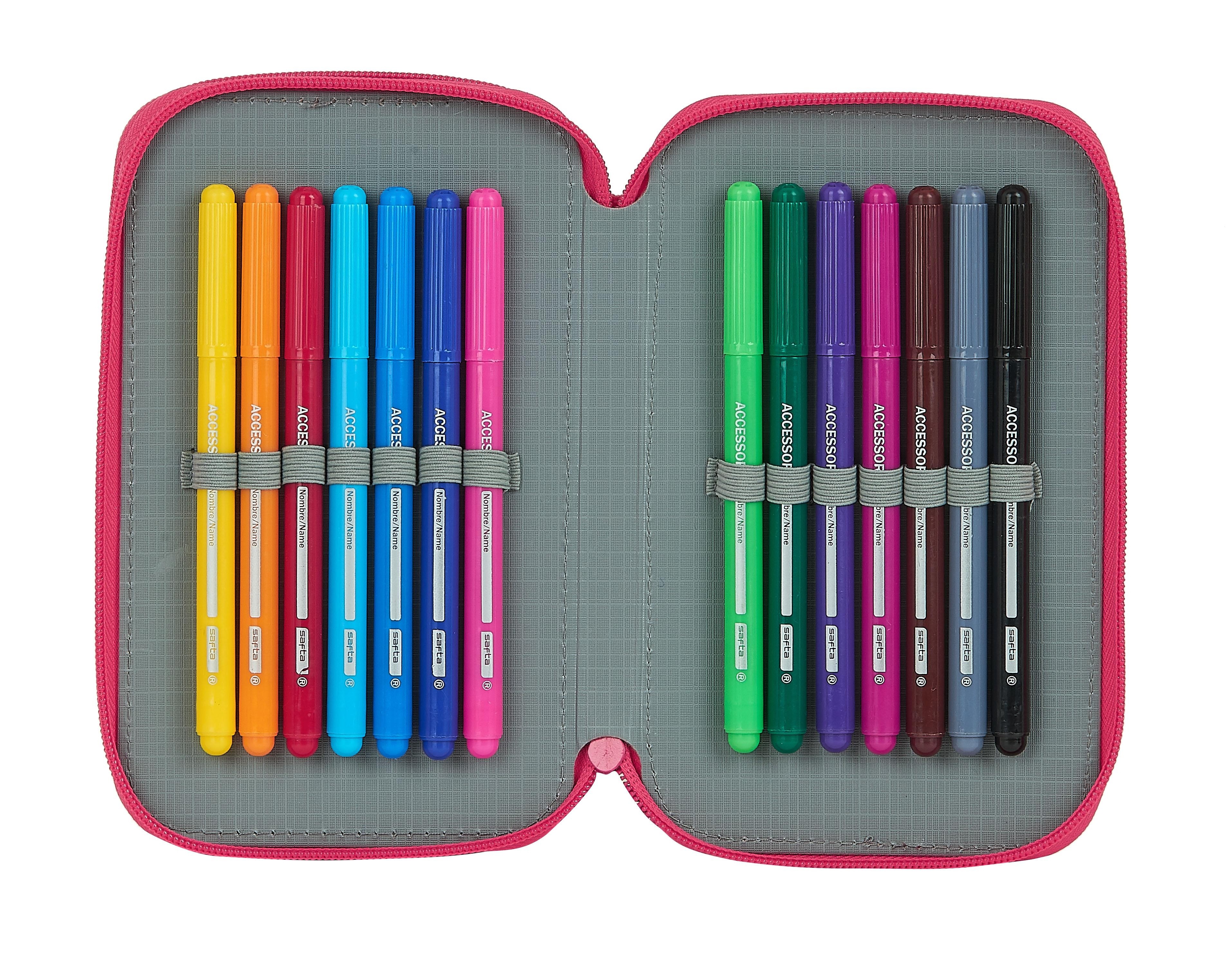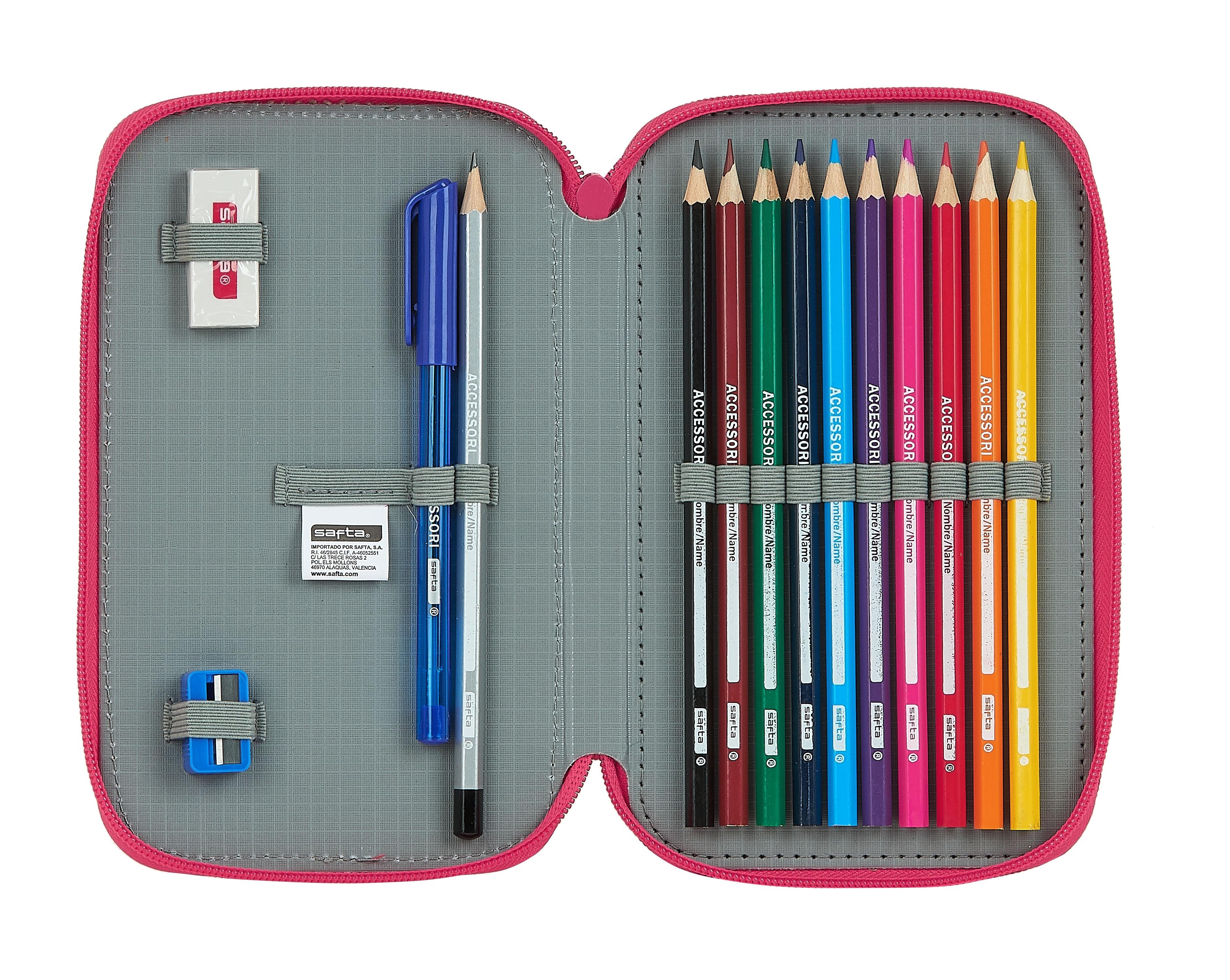 - Contenido: 10 lápices de colores, 14 rotuladores, 1 lápiz de grafito, 1 bolígrafo, 1 goma de borrar, 1 sacapuntas.