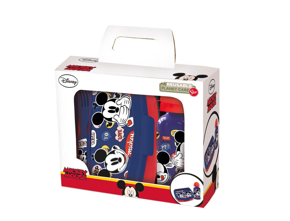 Este set está fabricado con materiales resistentes y seguros para los niños. La botella tiene una tapa hermética que evita derrames, la sandwichera tiene un cierre seguro y los cubiertos son de acero inoxidable con divertidos diseños de Mickey Mouse.