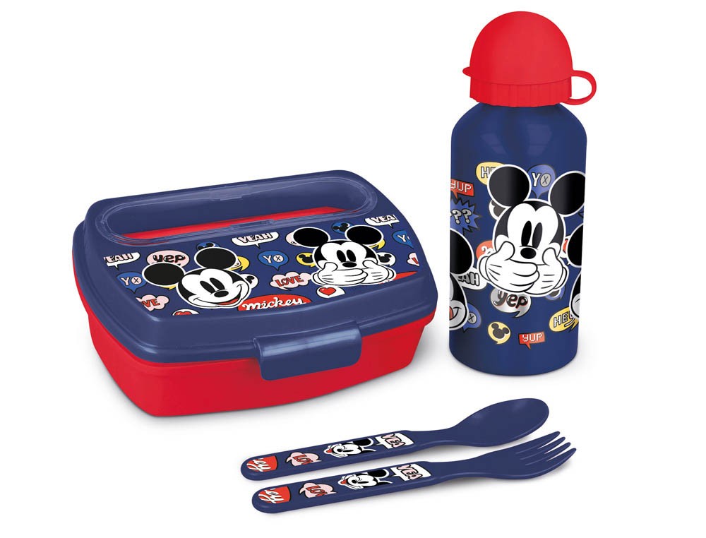 Set De Botella Y Sandwichera + Cubiertos Mickey Mouse Happy Smiles