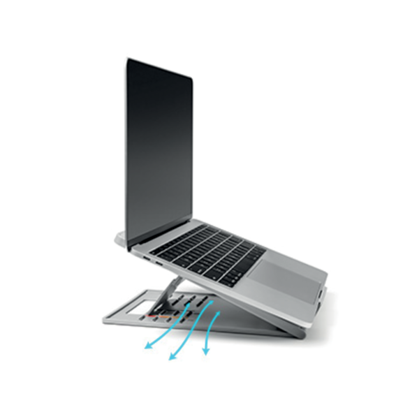 El elevador y soporte enfriador ergonómicos y ajustables para portátiles o tabletas Kensington® SmartFit® Easy Riser™ Go combina los beneficios ergonómicos de elevar la altura de su pantalla con los beneficios tecnológicos que mejoran la circulación del aire de su portátil o tableta. Este producto de diseño 2 en 1 permite ajustar tanto la altura como el ángulo para mejorar la postura, favorecer una correcta alineación de los ojos y mejorar la comodidad del cuello y los hombros.