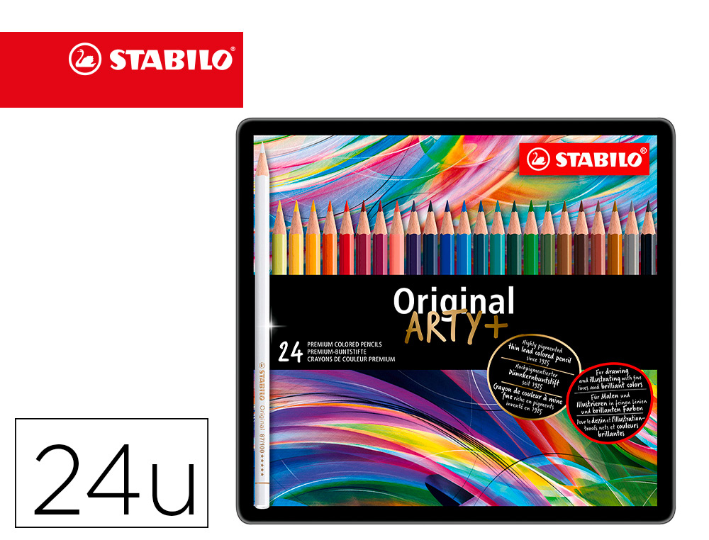 El estuche metálico de 24 colores surtidos contiene lápices de colores Stabilo Acuarelables Original Arty de alta calidad. Cada lápiz está fabricado con pigmentos de gran intensidad y resistencia a la luz, ofreciendo una amplia gama de tonos para dar vida a tus obras.
