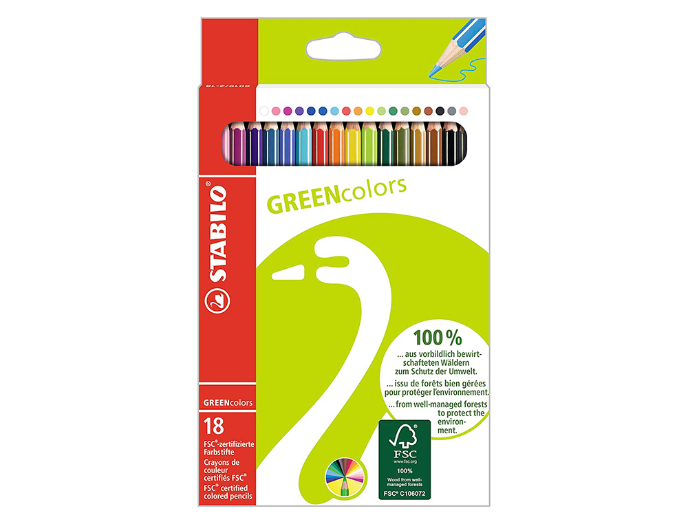 Los lápices de colores Stabilo Green Colors con certificado FSC son un set de 18 unidades de colores surtidos en un estuche de cartón. Son lápices de alta calidad, resistentes y respetuosos con el medio ambiente, ya que cuentan con el certificado FSC que garantiza que la madera utilizada proviene de bosques gestionados de forma sostenible.