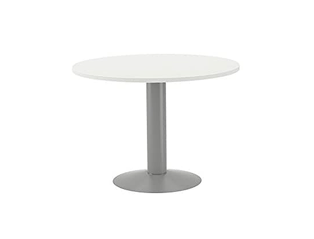 La Mesa De Reunion Rocada Meeting 3006At04 cuenta con una estructura de columna de acero gris, lo que le proporciona resistencia y durabilidad. Su tablero está fabricado en madera blanca de alta calidad, con un diámetro de 120 cm que permite acomodar cómodamente a varias personas alrededor de la mesa.