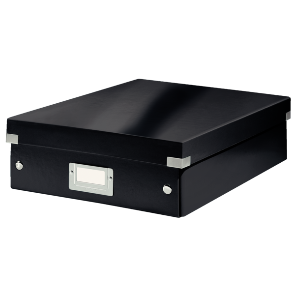 La caja de almacenamiento y transporte universal mediana para documentos A4 es un producto fabricado con cartón resistente y una superficie plastificada. Cuenta con esquineras metálicas que ofrecen una sólida protección y resistentes asas de metal para facilitar el transporte. Además, incluye un portaetiquetas que simplifica la indexación. Este diseño actual queda perfecto en cualquier oficina y puede plegarse para ahorrar espacio cuando no se utiliza.