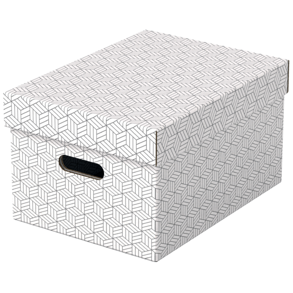 La Caja de almacenamiento para el hogar Esselte mediana es un conjunto de tres cajas de cartón decorativas y elegantes, ideales para crear un almacenamiento instantáneo en casa. Cada caja cuenta con tapa extraíble, asas de transporte integradas y un diseño geométrico de dos colores para agregar estilo al espacio de almacenamiento.