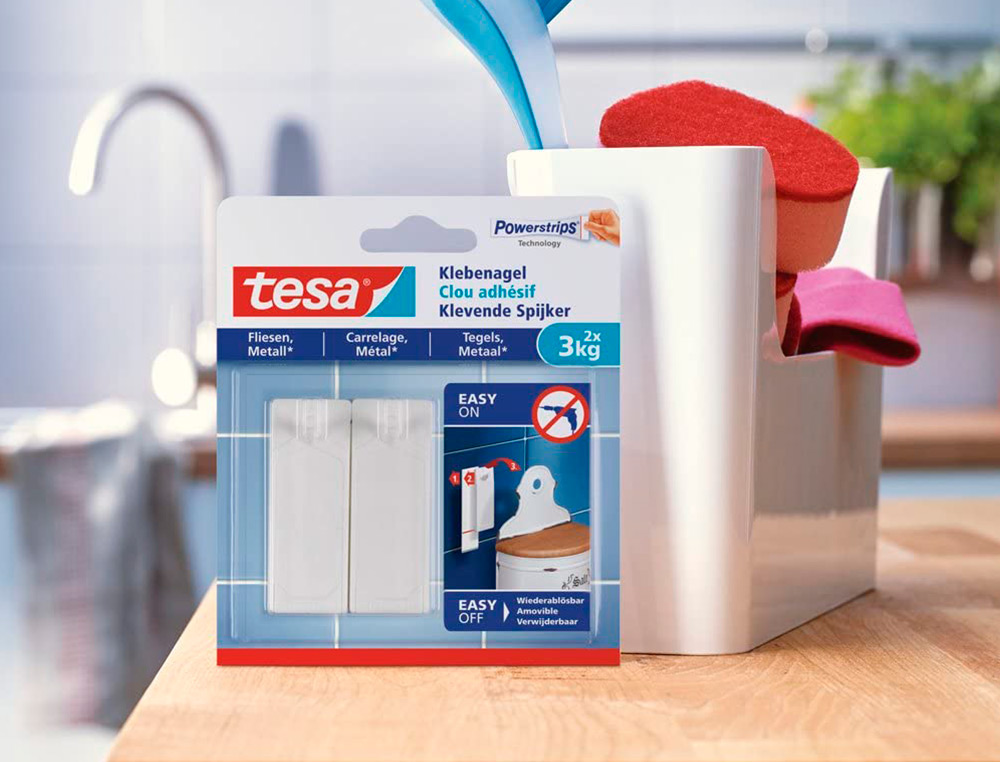 Clavo Autoadhesivo Tesa es un producto de sujeción fabricado por la marca Tesa. Viene en un blister que contiene 2 unidades y está diseñado para sostener hasta 2 Kg de peso. Es especialmente útil para la fijación de azulejos en distintas superficies.