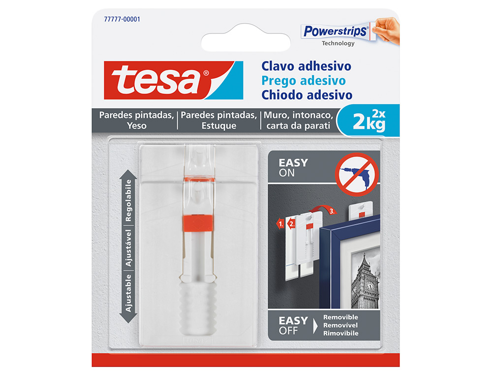 El Clavo Autoadhesivo Tesa es un sistema de sujeción para objetos de hasta 2 kg en paredes pintadas. Viene en un blister de 2 unidades y es removible, lo que lo hace ideal para decoraciones temporales o alquileres donde no se pueden hacer agujeros en la pared.