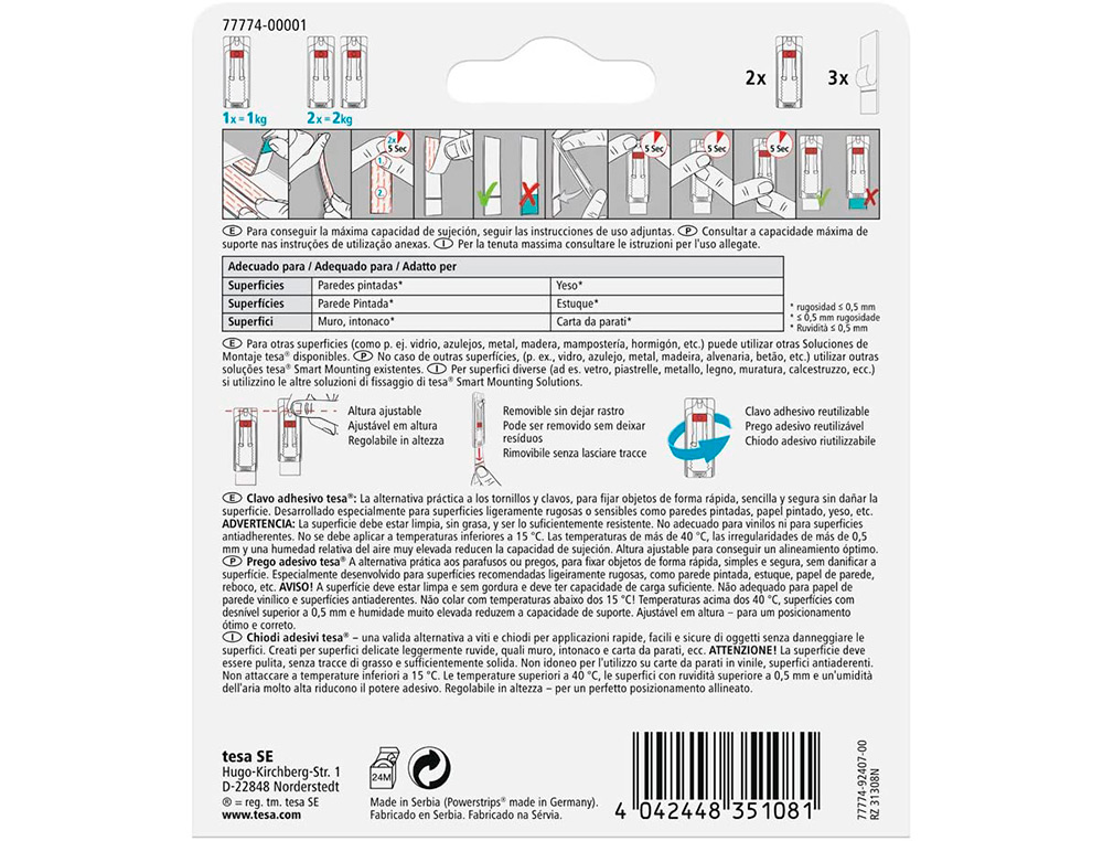 El Clavo Autoadhesivo Tesa está compuesto por un adhesivo de alta calidad que no dañará la pintura de la pared al ser removido. Su diseño permite una sujeción segura de hasta 2 kg, proporcionando tranquilidad y comodidad al usuario. Además, su presentación en blister de 2 unidades lo hace conveniente para múltiples aplicaciones en el hogar o la oficina.