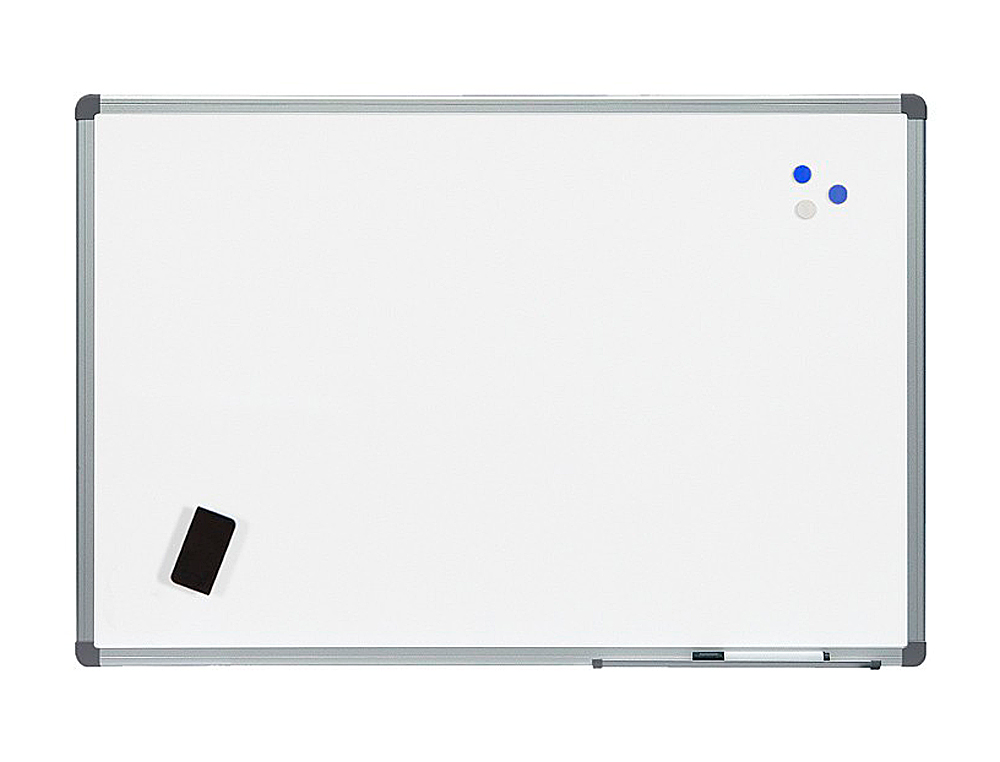 La pizarra está fabricada con acero vitrificado magnético, lo que la hace resistente y duradera. Está enmarcada con aluminio y cuenta con cantoneras de PVC para proteger las esquinas de posibles daños. Este diseño garantiza la calidad y longevidad del producto.