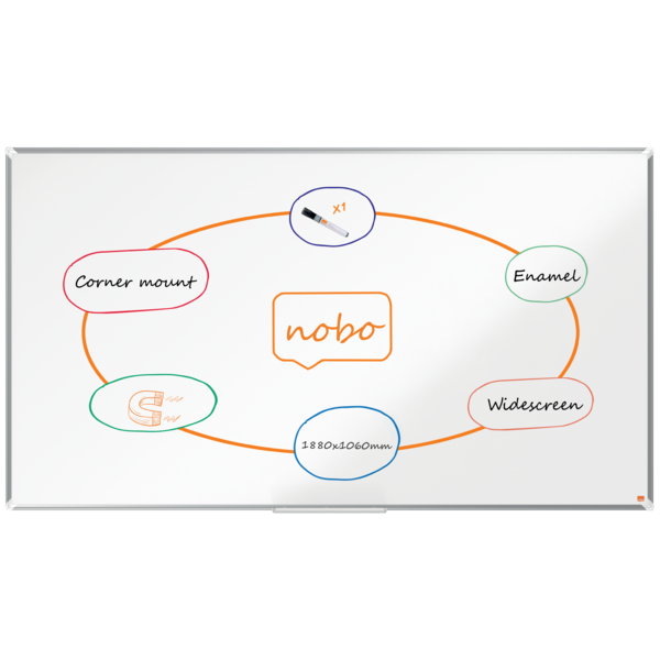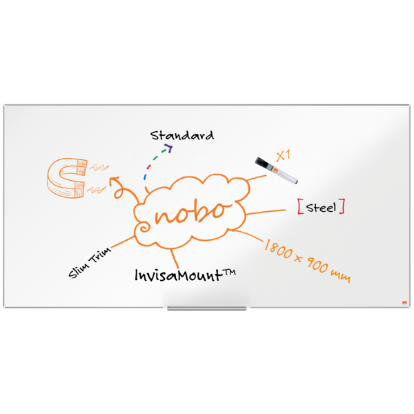 La Pizarra De Melamina Nobo Premium Plus de 1800x1200mm Blanco es un tablero no magnético con un moderno y elegante acabado de aluminio. Está diseñado para ser fijado a la pared desde las esquinas, lo que le brinda estabilidad y firmeza. Viene equipado con una bandeja para guardar cómodamente rotuladores y borradores, lo que facilita su uso y almacenamiento.