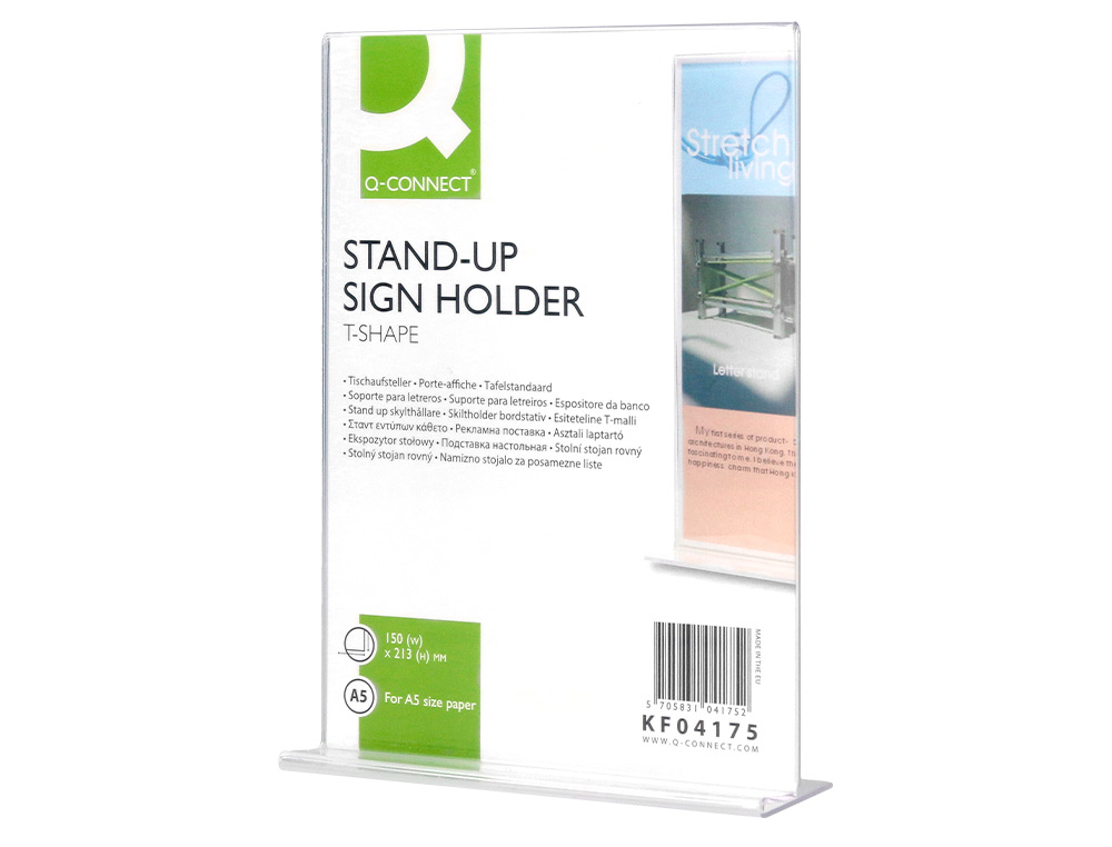 El expositor de sobremesa Q-Connect con forma de T está diseñado para mostrar información de forma clara y organizada en cualquier superficie plana. Con un tamaño A5 y la capacidad de ser visualizado desde ambos lados, este expositor es ideal para exhibir folletos, menús, ofertas y más en negocios, tiendas, eventos o cualquier lugar donde se necesite comunicar mensajes de manera efectiva.
