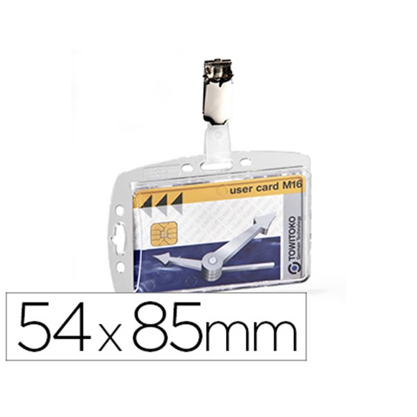 Este identificador con pinza está fabricado con materiales de alta calidad que garantizan su durabilidad y resistencia. La pinza es de metal resistente y la parte transparente que protege el documento es de plástico resistente a la manipulación diaria.