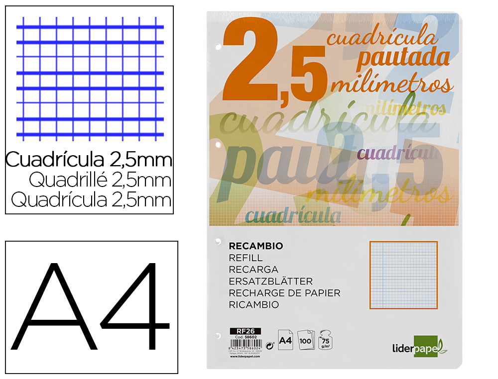 El Recambio Liderpapel A4 Pautaguia es un conjunto de 100 hojas de papel cuadriculado, diseñadas para facilitar la escritura y el dibujo con un cuadriculado pautado de 2,5 mm con margen y 4 taladros para su fácil organización en carpetas de anillas. Cada hoja tiene un tamaño estándar A4 (210 x 297 mm) y un gramaje de 75 g/m2, lo que la hace ideal para su uso diario en la escuela, la universidad o la oficina.