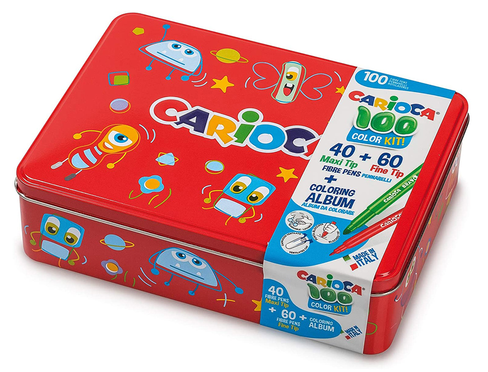 El Rotulador Carioca Color Kit es un set de 100 unidades de rotuladores surtidos, presentados en una caja metálica, que incluye además un álbum para colorear. Los rotuladores son de alta calidad y ofrecen una gran variedad de colores vibrantes y llamativos que permiten realizar trabajos de arte y diseño de forma creativa.