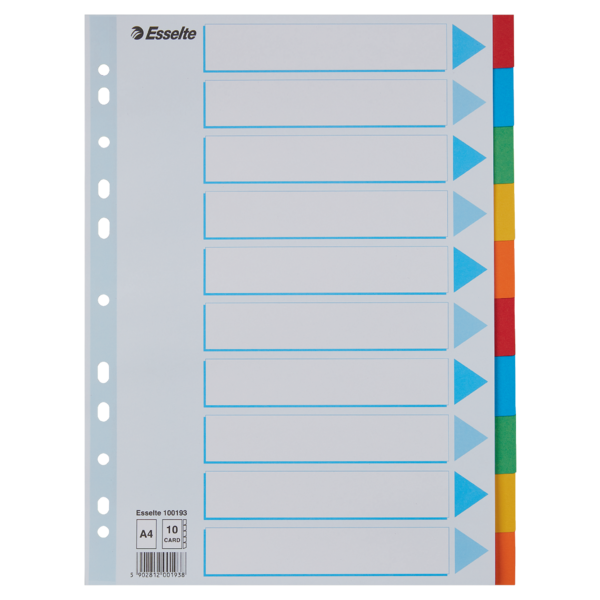 Los Separadores Cartón Multicolor A4 son un conjunto de 10 pestañas en blanco diseñadas para organizar y separar documentos en formato A4. Están disponibles en varios gramajes, con o sin carátula índice, y están fabricados en cartón resistente y duradero.