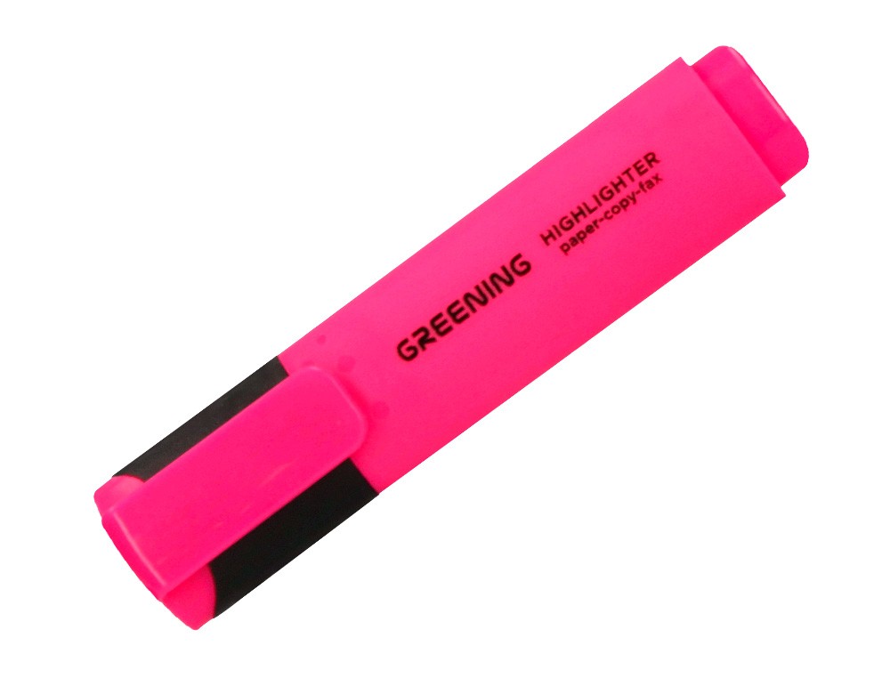 El rotulador GREENING Fluorescente Punta Biselada Rosa es un marcador de color rosa fluorescente que utiliza tinta de calidad para resaltar y destacar textos, dibujos o notas importantes en papel.